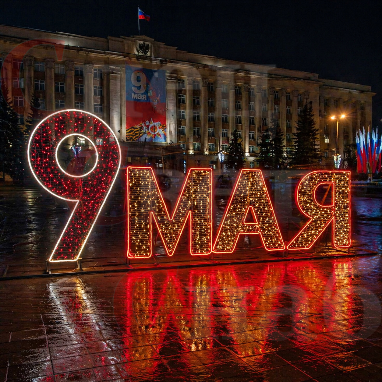 Стильные буквы с изюминкой: Не менее эффектно смотрятся буквы "9 мая", выполненные из тепло-белой морозостойкой гирлянды. Этот нежный оттенок создает ощущение уюта и тепла, напоминая о мирном небе над головой.